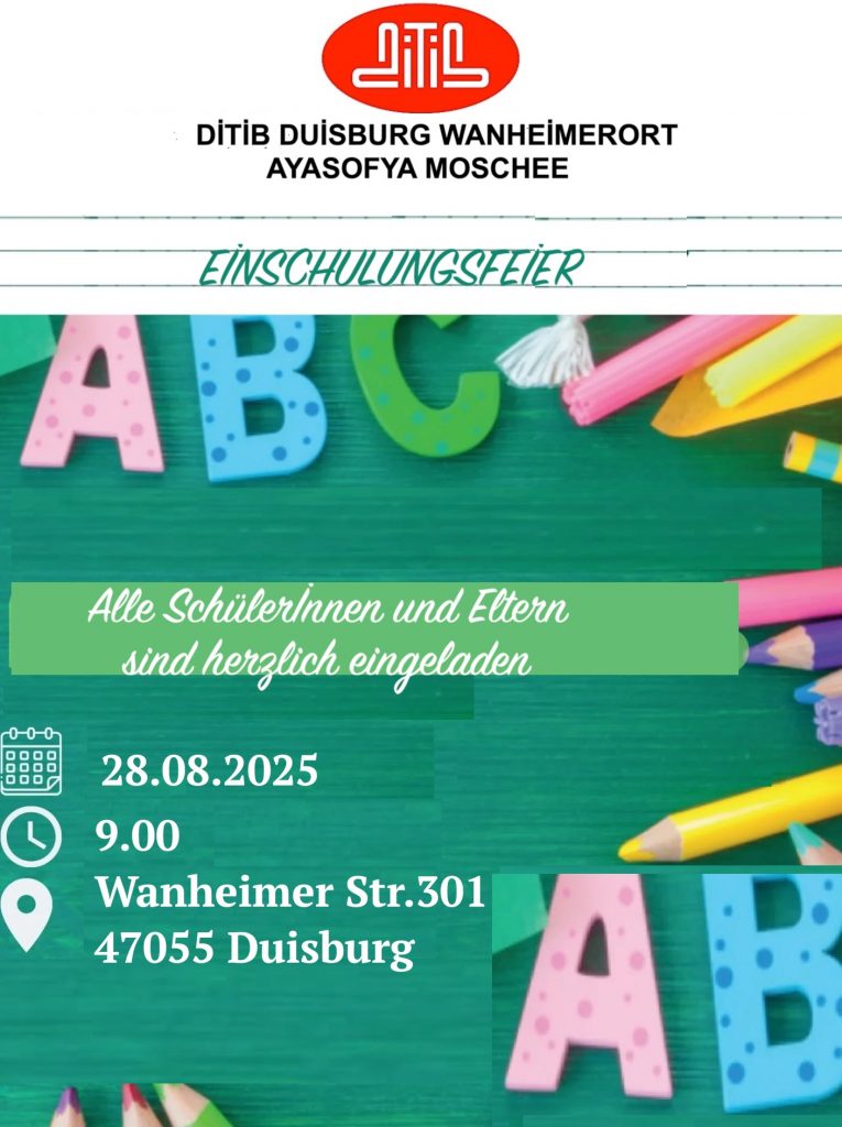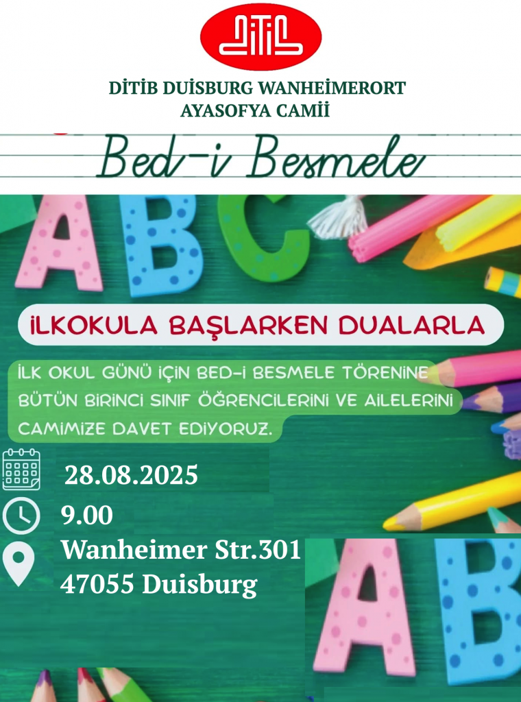 DİTİB Türk İslam Cemiyeti Duisburg Wanheimerort Ayasofya Camii okula başlama duası Bed-i Besmele etkinliğini 25’İnci kez düzenleyecek. Etkinliğe okula başlayacak çocuklarımız ve velileri davetlidir.