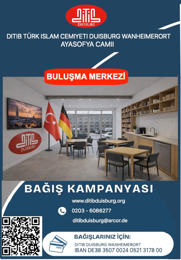 DİTİB Türk İslam Cemiyeti Duisburg Wanheimerort Ayasofya Camii yönetim kurulu adına Adnan Mavi: ‘Camimizin yanında bulunan lokalimizin tadilatı ve tamiratı için yardım kampanyası başlattık. Semtimizin ve cemiyet mensuplarımızın farklı amaçlarla kullanabileceği buluşma merkezimiz için yardımlarınızı bekliyoruz’ dedi.