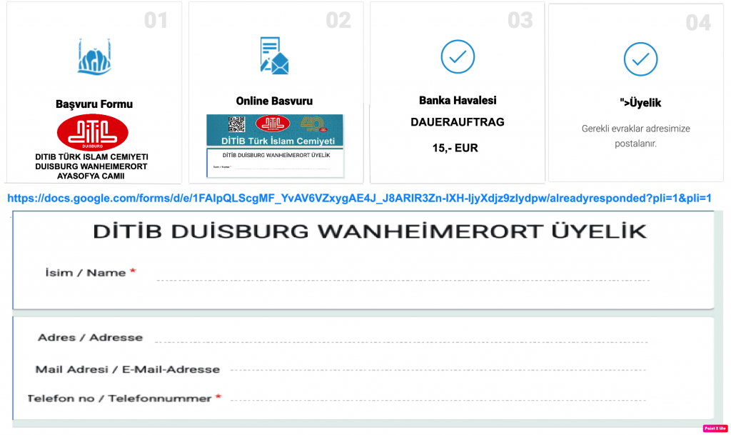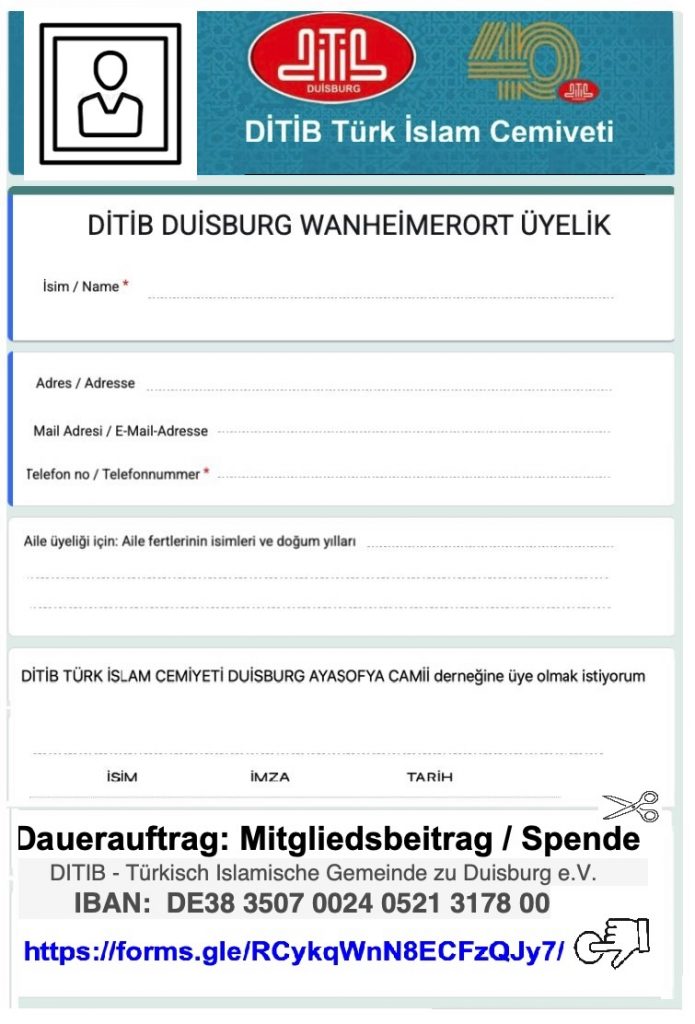 DİTİB TÜRK İSLAM CEMİYETİ DUİSBURG WANHEİMERORT AYASOFYA CAMİİ derneğine üye olalım. Üyelik için online form: